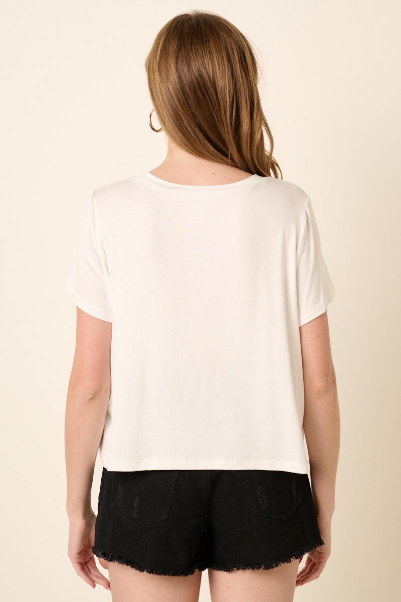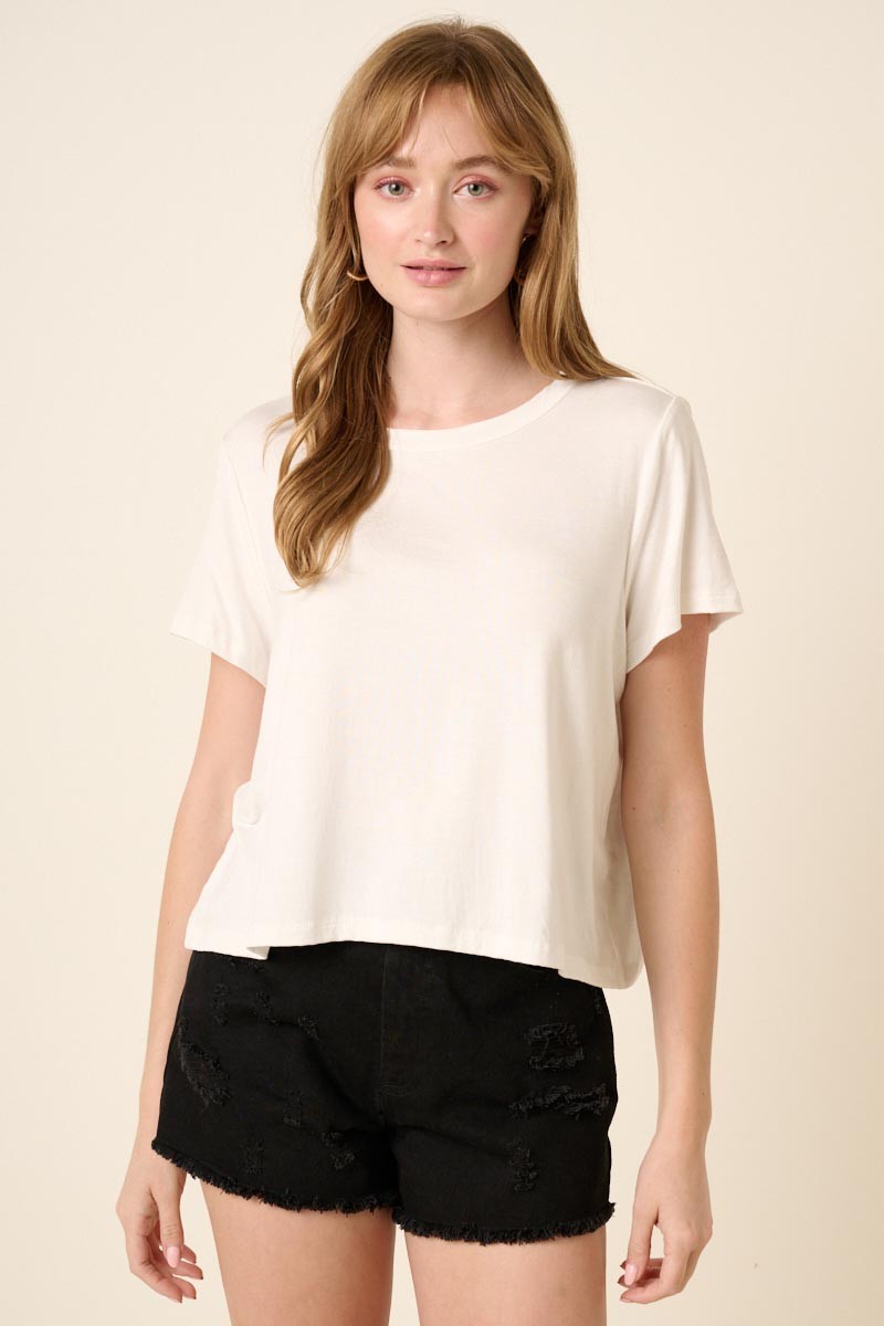 Experience comfort and style with the Soft Heart Round Neck Crop Top. Crafted from breathable bamboo knit fabric, it offers a soft touch against your skin. The round neck and short sleeves provide a classic look, while the crop length and straight hemline add a trendy edge. Perfect for pairing with high-waisted bottoms, this top combines effortless fashion with everyday ease.