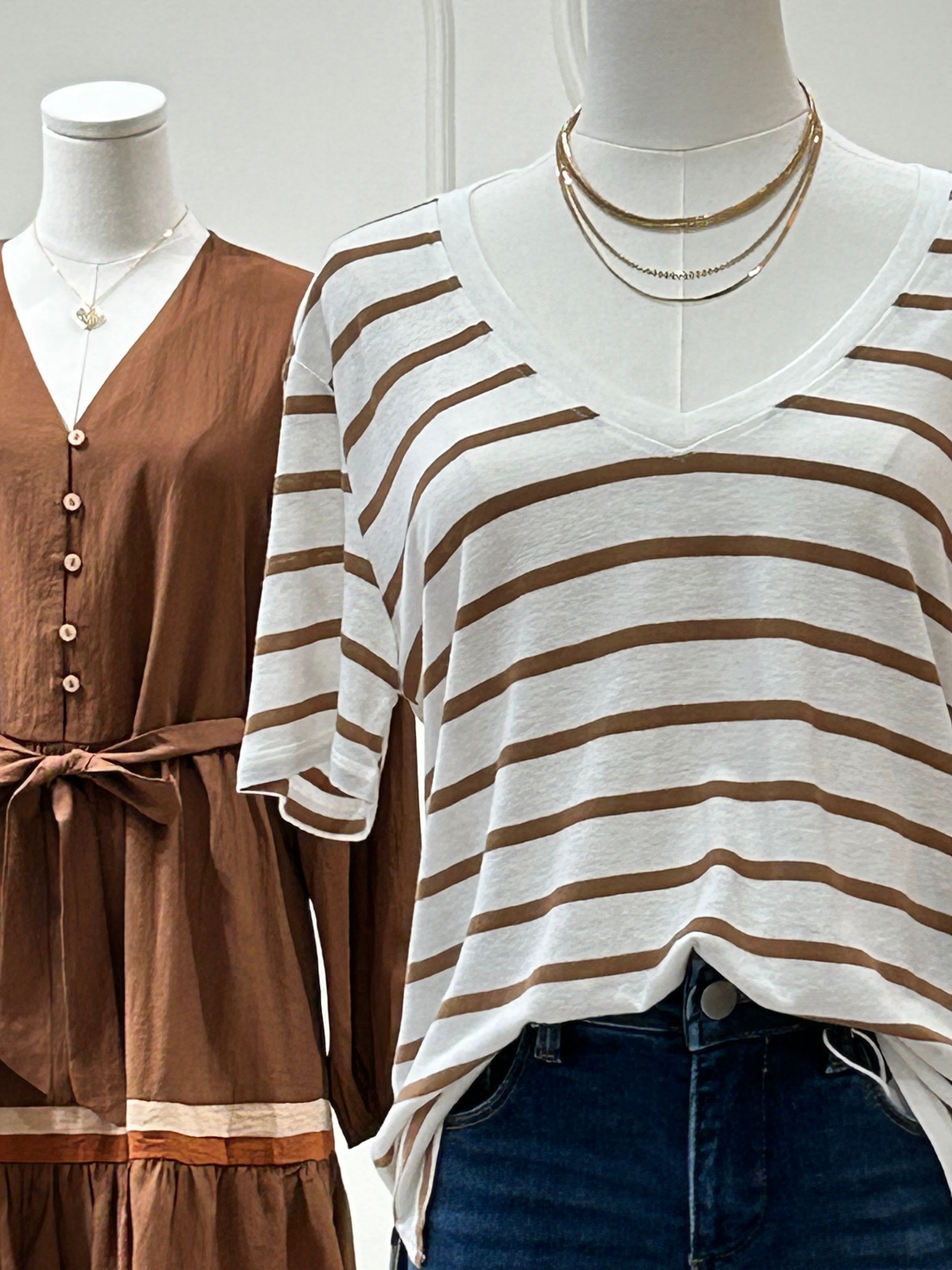 Bring a splash of fun to your everyday wardrobe with the Strike a Stripe Relaxed Fit T-Shirt. Featuring playful stripes, this short-sleeve V-neck is crafted from a soft cotton-linen blend for breathable comfort. Its relaxed fit makes it easy to wear all day long, whether you're out and about or just chilling at home. Effortless style meets cozy vibes in one perfect tee!