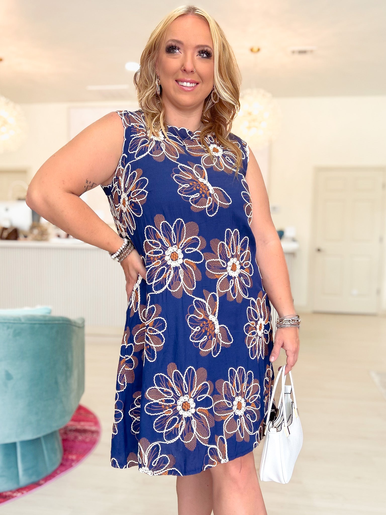 Elevate your style with the Garden Meandering Floral Dress, featuring delicate floral embroidery that adds a touch of elegance. Its sleeveless, A-line silhouette and mini length offer a flattering fit and ease of movement, perfect for warm days or special occasions. The round neck completes the look with simple sophistication, making this dress a versatile and charming addition to your wardrobe.