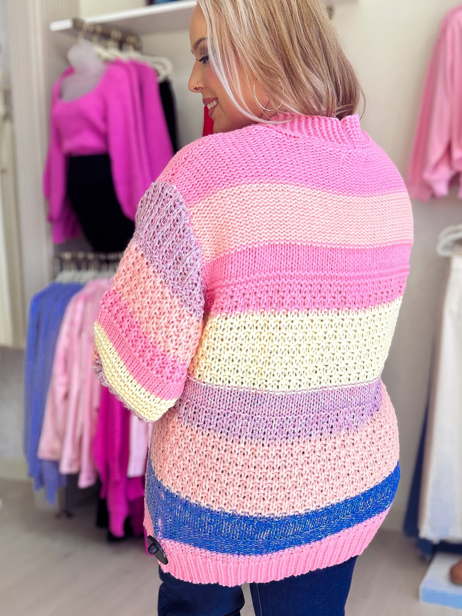 Elevate your everyday style with this stunning multi-color stripe open cardigan that effortlessly blends comfort and fashion. Crafted with multi-textured chunky knit and a handmade effect, this piece features bold wide stripes and a relaxed oversized fit that flatters every silhouette. The balloon long sleeves add a playful touch while the hip-covering length provides the perfect amount of coverage. Wear it open over your favorite tee or dress it up as a statement layer—this versatile cardigan is your go-to for cozy-chic vibes all season long.