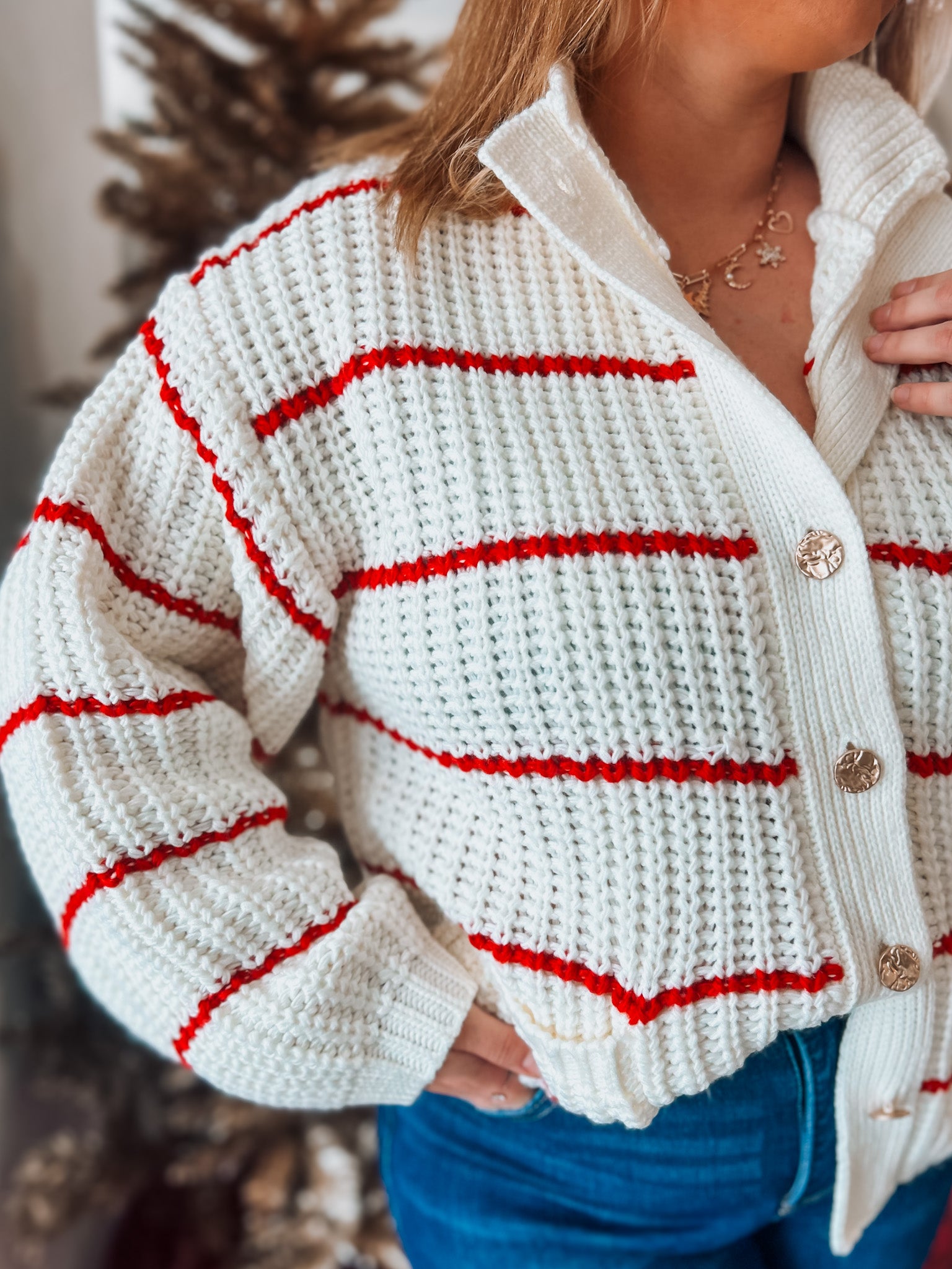 Stay cozy and stylish with this Chunky And Slouchy Button Up Cardigan. Designed with a trendy mock neck and bold stripes, it offers a flattering relaxed fit that complements any casual look. The chunky knit provides warmth without sacrificing comfort, making it perfect for layering on chilly days. Button up for versatile wear that effortlessly elevates your wardrobe essentials.