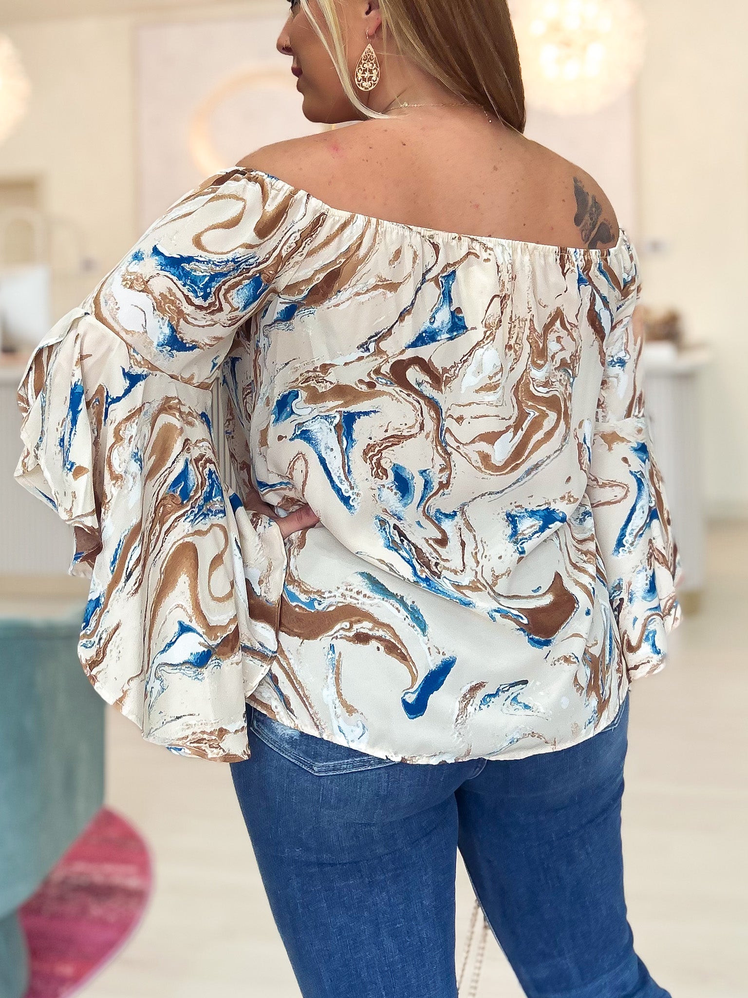 Embrace effortless style with the Talking Tulips Marble Top. Featuring an off-shoulder design and delicate tulip bell sleeves, this top blends elegance with a modern marble print for a unique statement. Perfect for elevating any outfit, it offers a flattering silhouette while keeping you comfortable and chic all day long.
