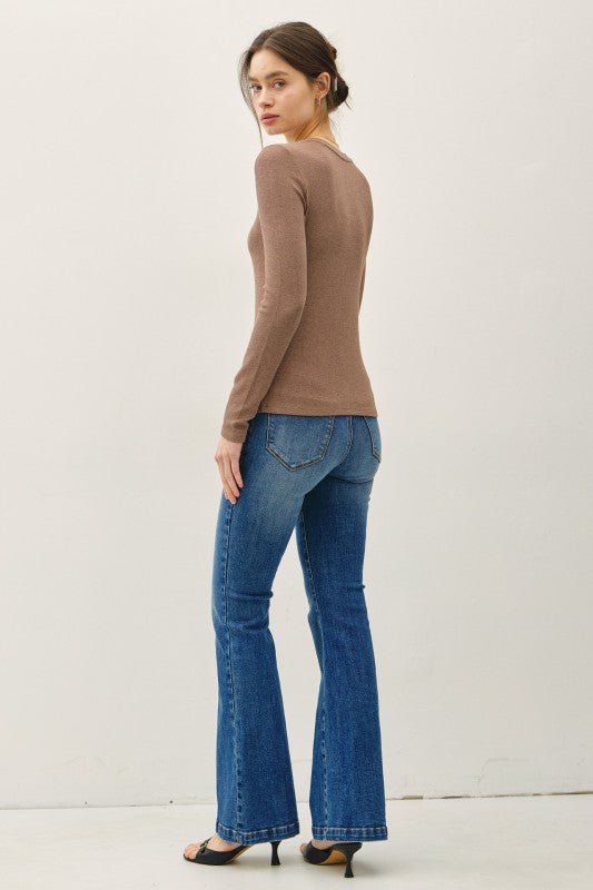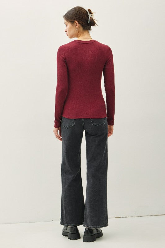 Embrace everyday comfort with this ultra-soft, ribbed V-neck top designed to hug your silhouette with a slim fit. Featuring a playful notched neck and long sleeves, this baby tee stretches just right for all-day ease. A casual classic that’s anything but basic, it’s your new go-to essential for effortless style.