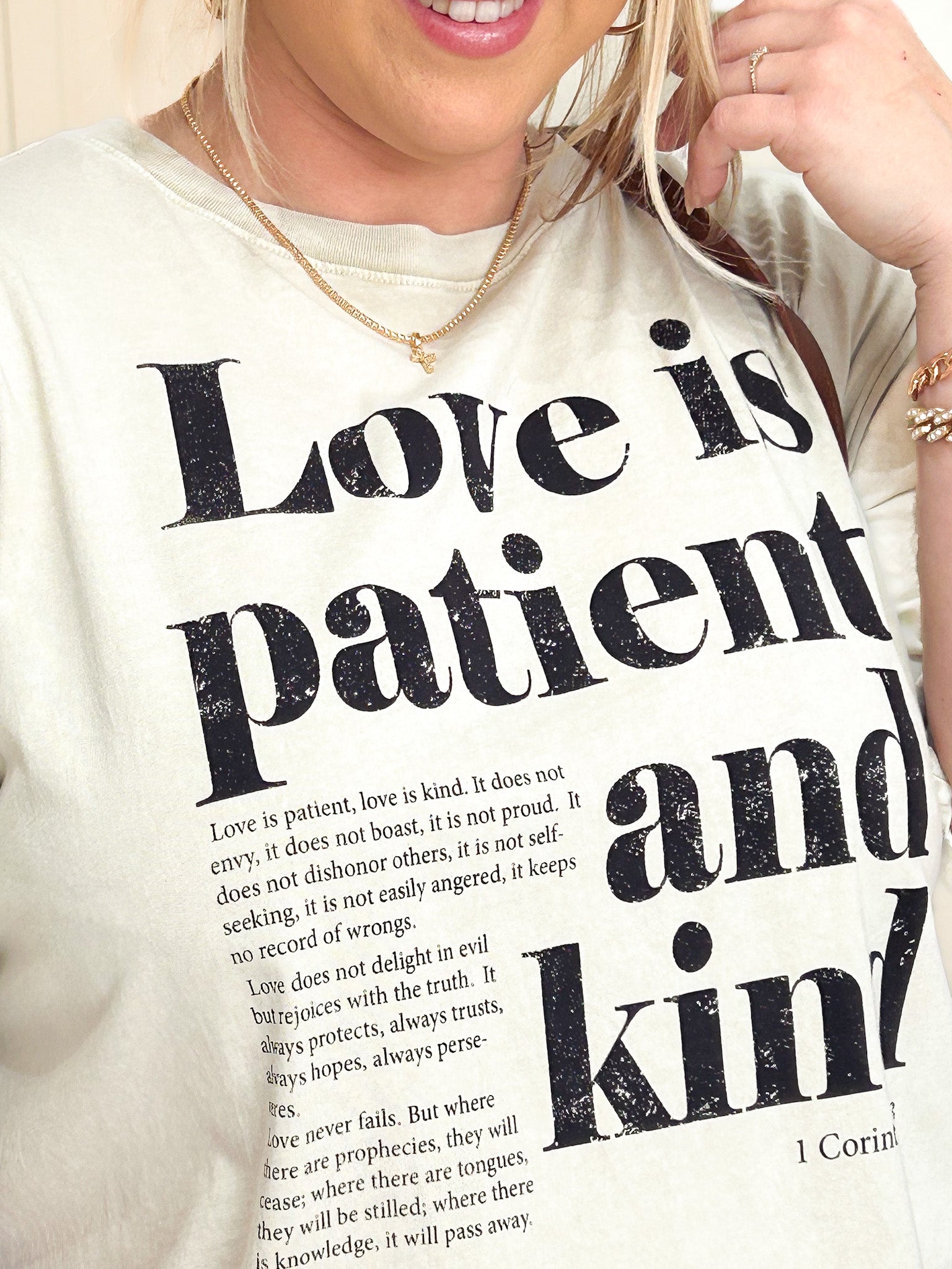 Love Is Patient And Kind Graphic Tee Wear your values with this meaningful graphic tee that celebrates timeless wisdom. Perfect for women who want to express compassion and kindness through their everyday style, this comfortable tee features an inspiring message that sparks conversations and connects you with like-minded souls. Whether you're dressing for casual outings, gifting to someone special, or making a personal statement, this versatile piece effortlessly blends comfort with purpose. Soft, breathable fabric keeps you feeling great all day long, while the eye-catching graphic design ensures you'll stand out for all the right reasons. A wardrobe essential that goes beyond fashion—it's a reflection of who you are.