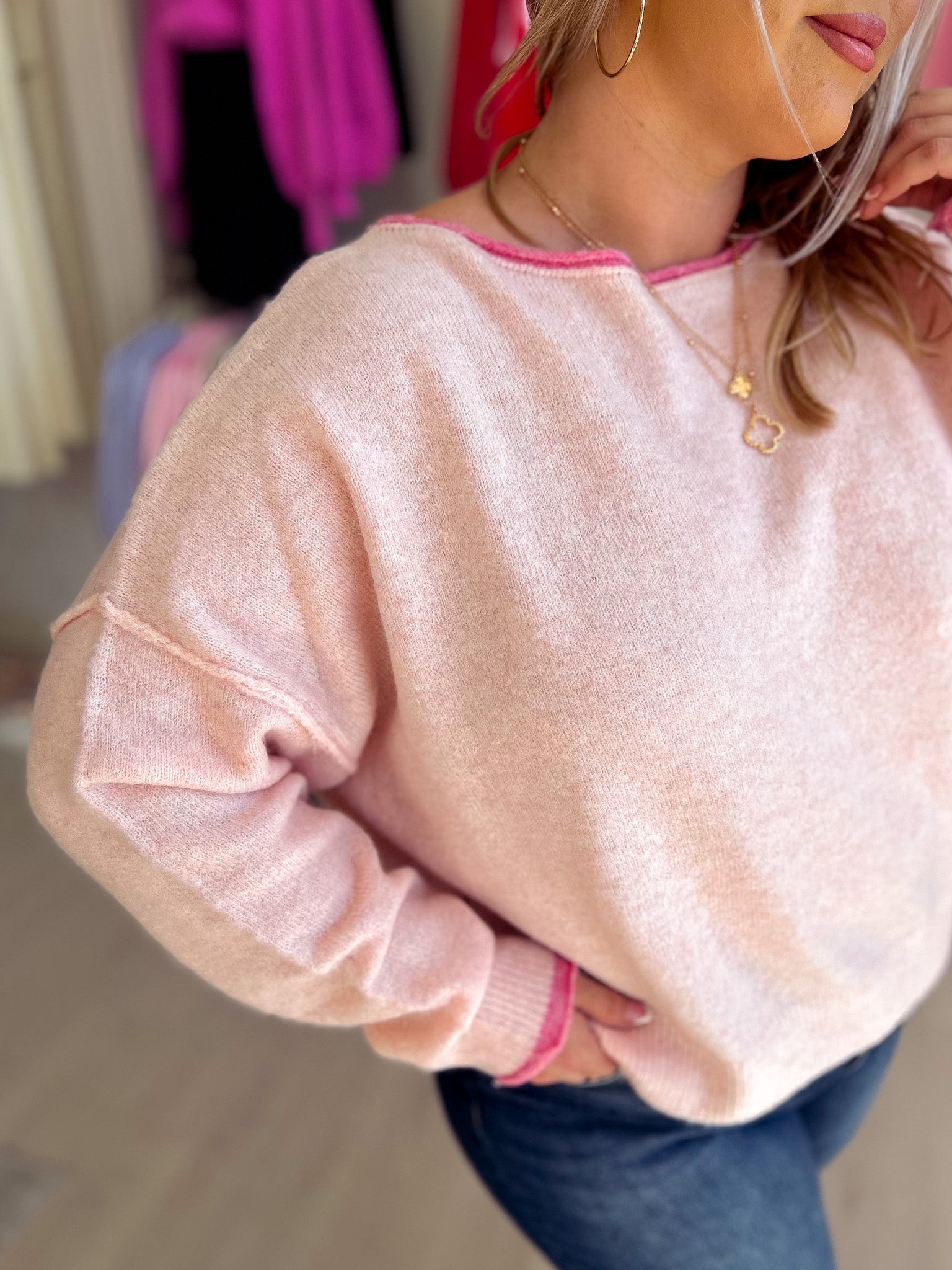 Slouchy and soft with an effortless drape, this fuzzy pullover is her cozy go-to for crisp days. Featuring contrast edge detailing and an oversized fit, she pairs it with anything from denim to a silk maxi. The relaxed drop shoulder silhouette creates an instantly polished look that feels anything but trying. Perfect for layering or wearing solo, this knit transitions seamlessly from casual weekends to elevated evenings—all while keeping her wrapped in cloud-soft comfort.